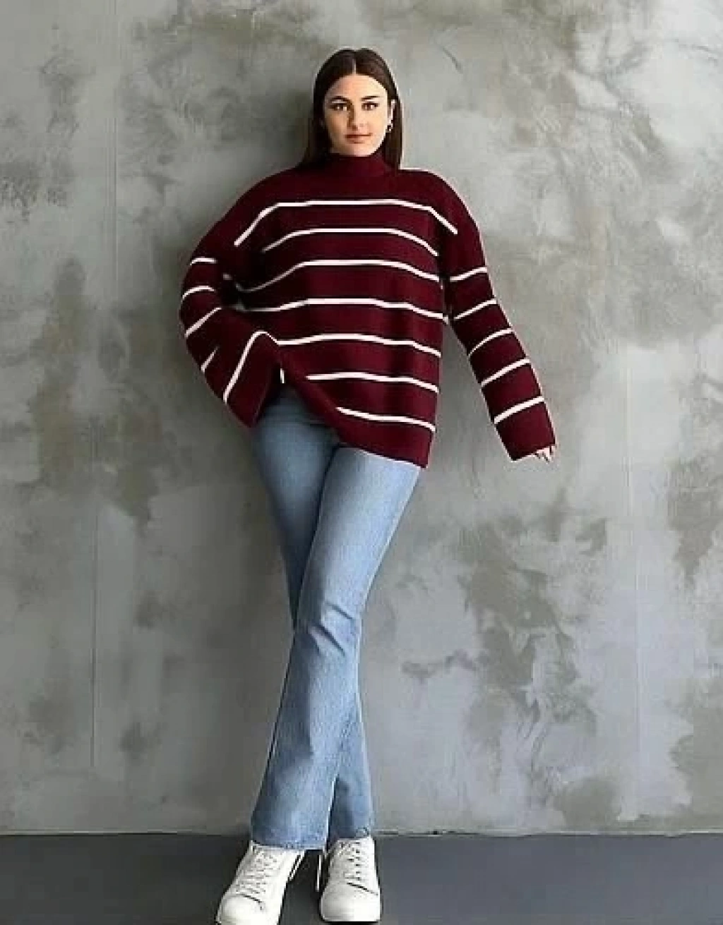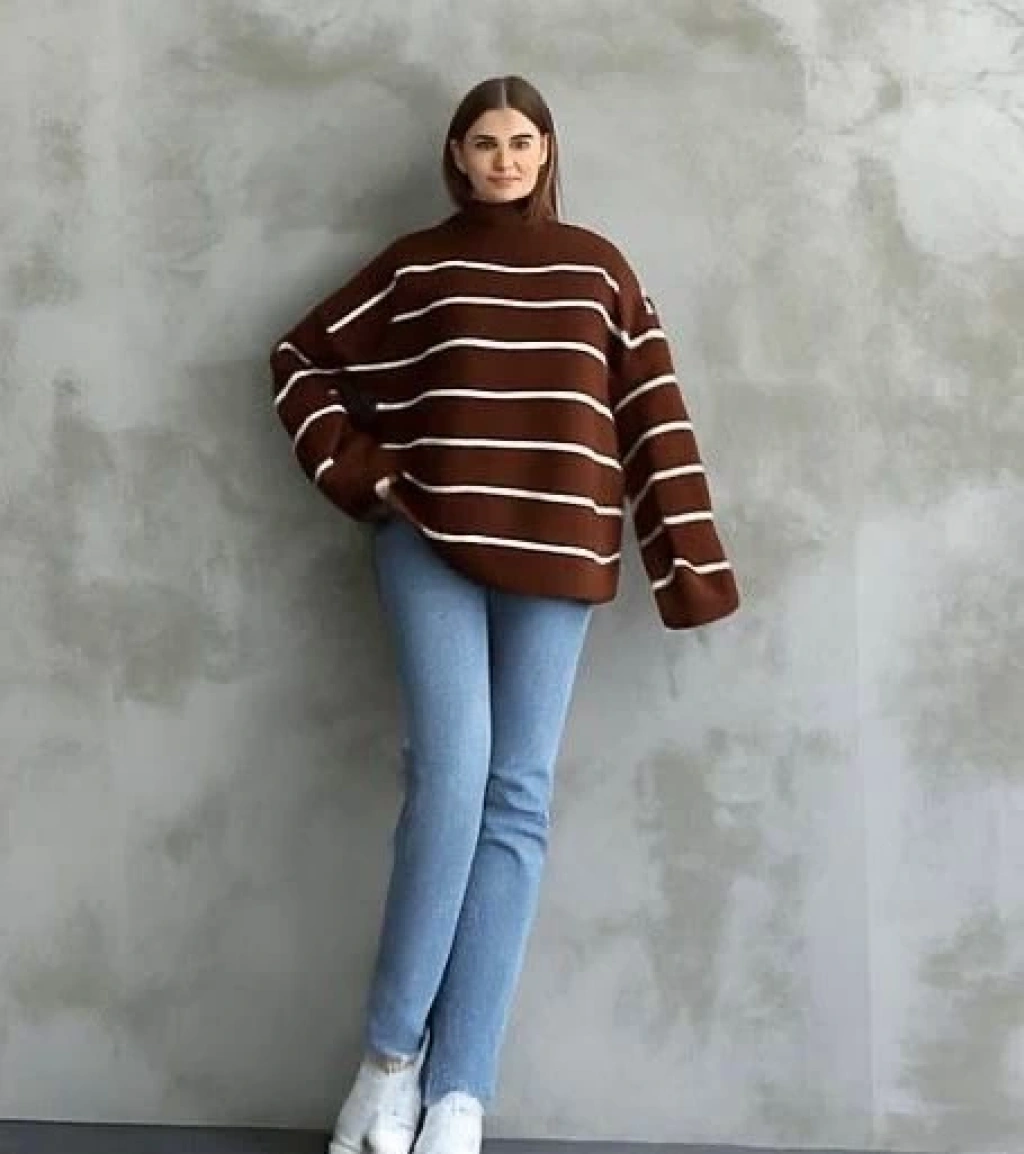 İspanyol tarzını yansıtan çizgili boğazlı triko kazak, gardırobunuzun vazgeçilmezi olmaya aday! Hem şık hem de rahat yapısıyla günlük kullanıma uygun olan bu kahve beyaz kazak, farklı kombinler oluşturmanıza olanak sağlar.