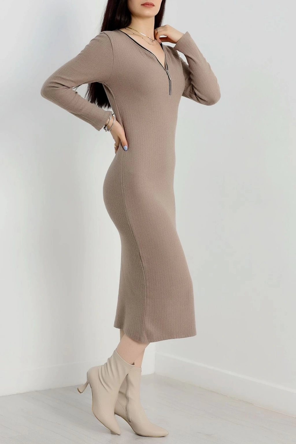 Fermuar detaylı fitilli şardonlu elbise bej a3178