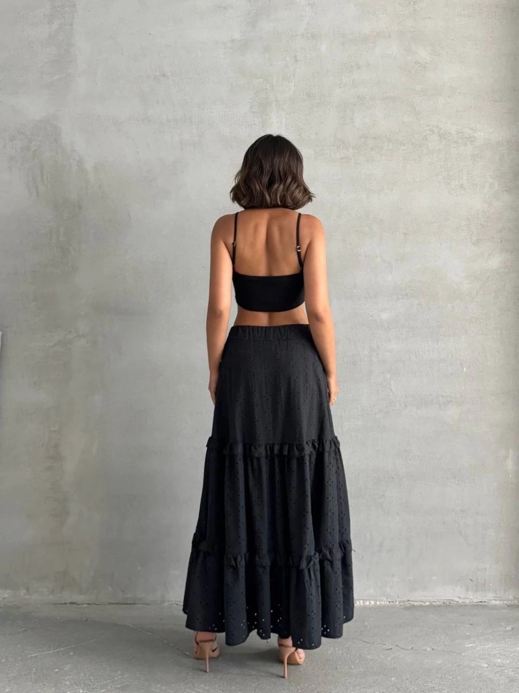 Şıklık ve tarzı bir arada sunan fırfırlı brodeli astarlı uzun etek, gardırobunuzun vazgeçilmez parçalarından olmaya aday.