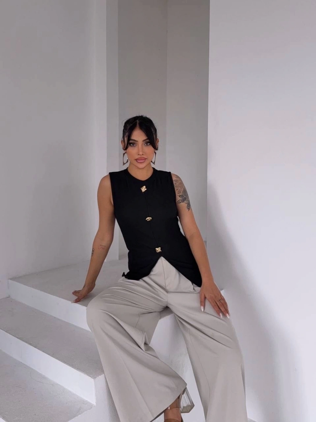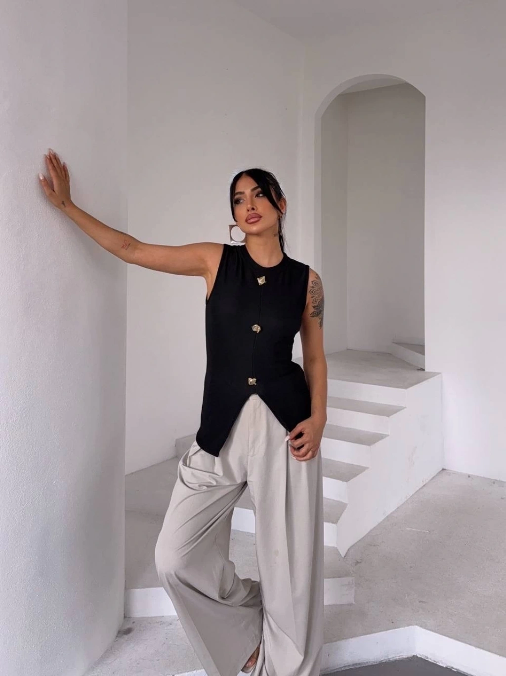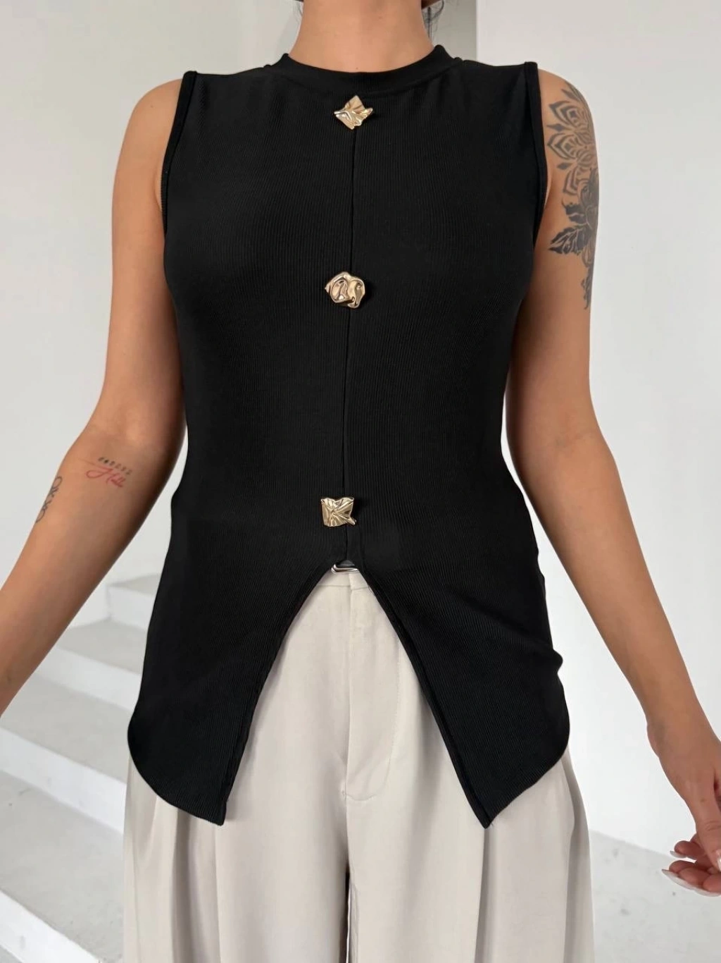 Bisiklet yaka tasarımıyla modern bir hava katan bluz, gold düğmeleriyle de göz alıcı bir detay sunuyor.