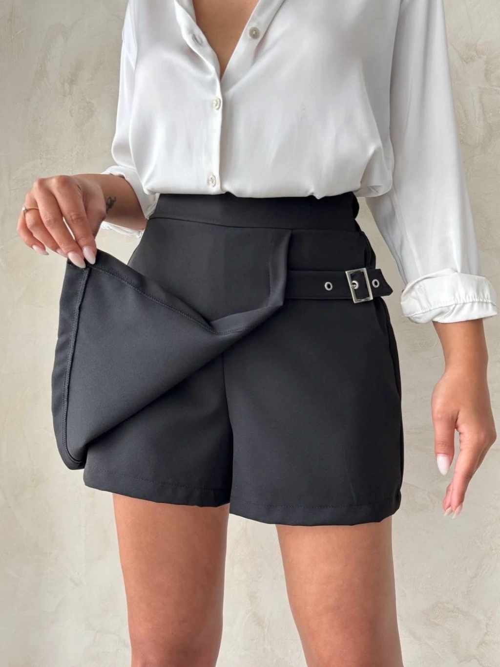 Kadın tokalı siyah şort etek, şıklık ve rahatlığı bir arada sunar. Markasız ürün, kaliteli kumaşı ve şık tasarımıyla öne çıkar.