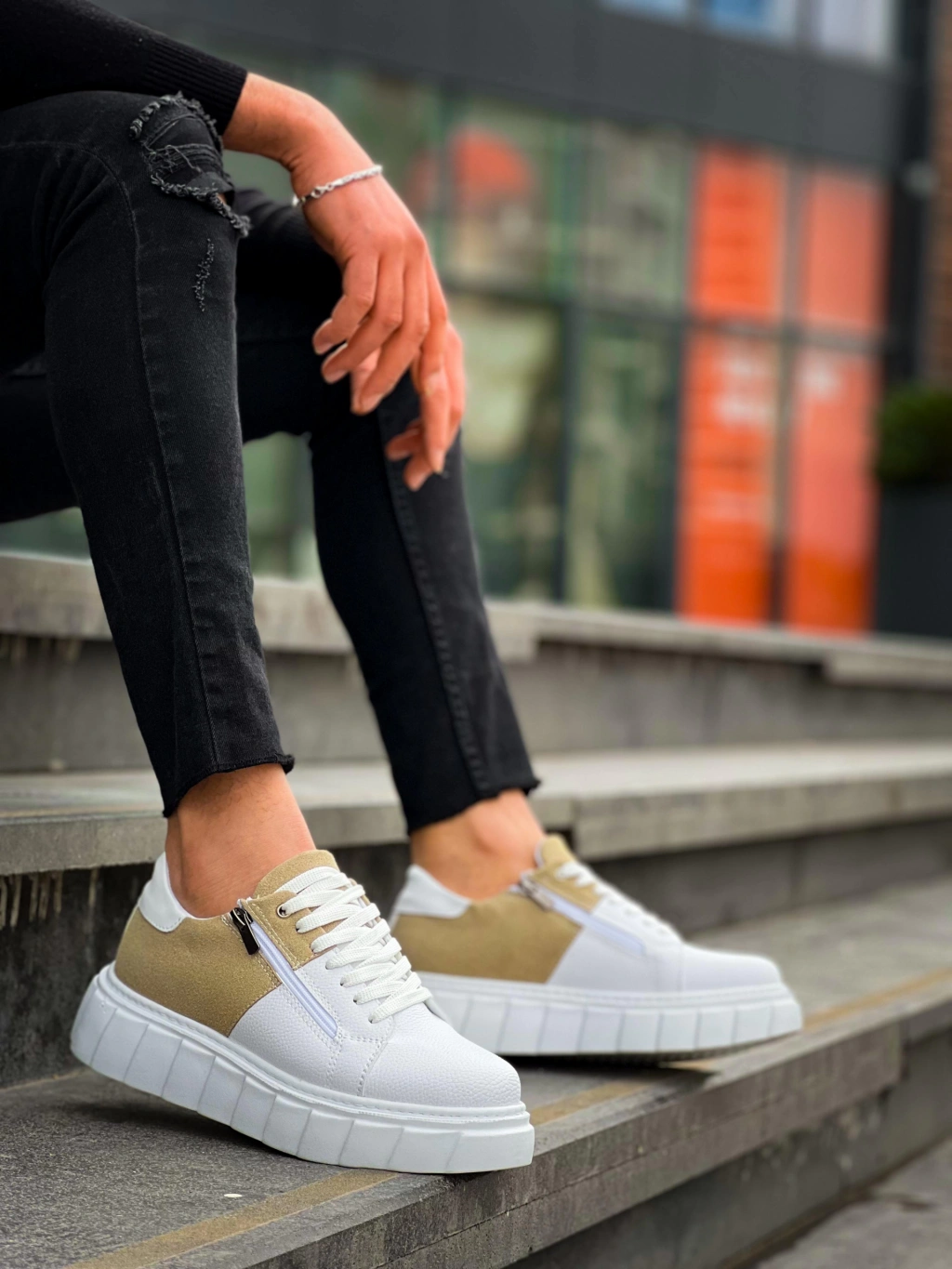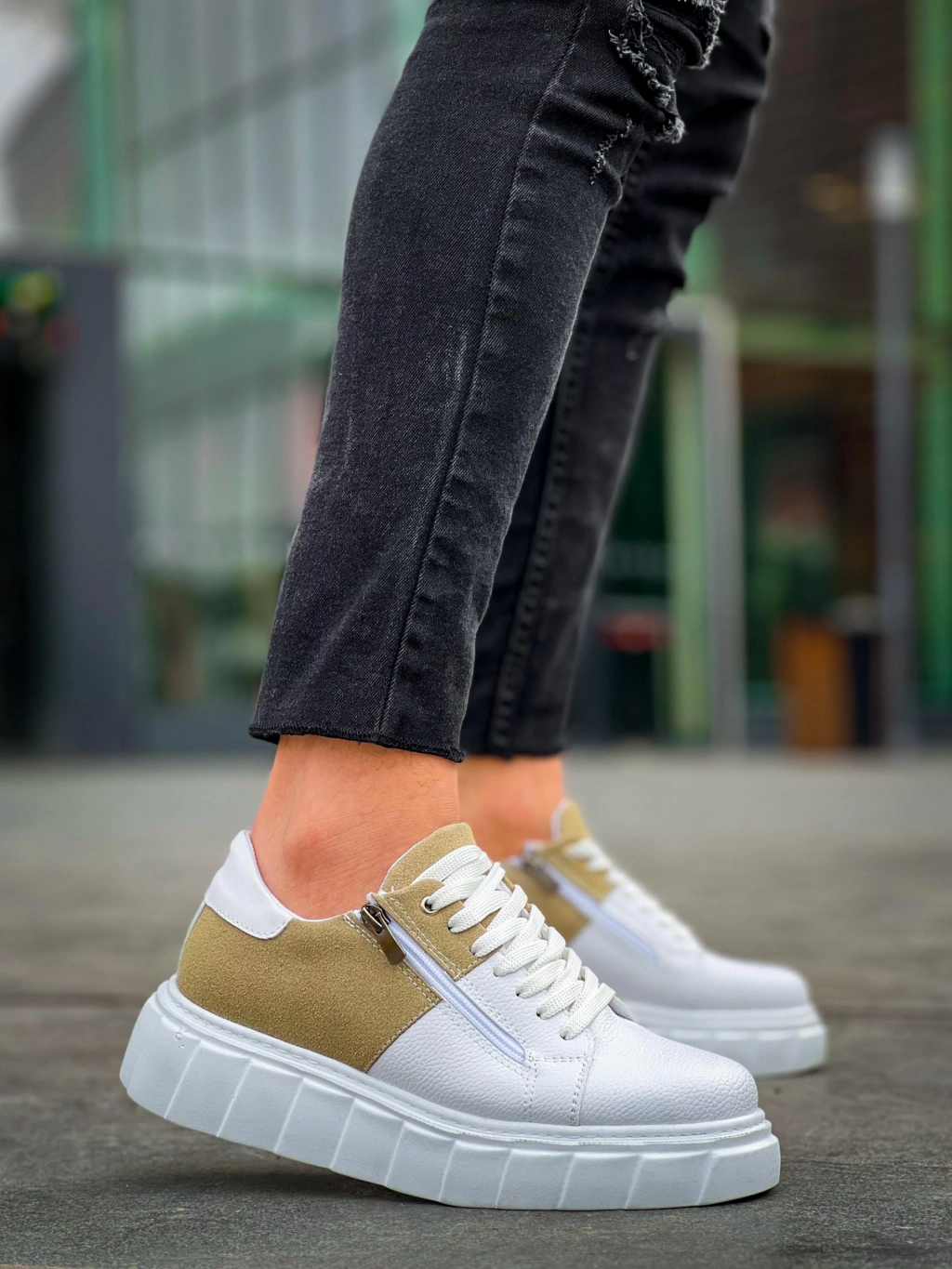 KB-X155 Kuback Beyaz Cilt Bej Süet Detaylı Beyaz Yüksek Taban Günlük Spor Ayakkabı