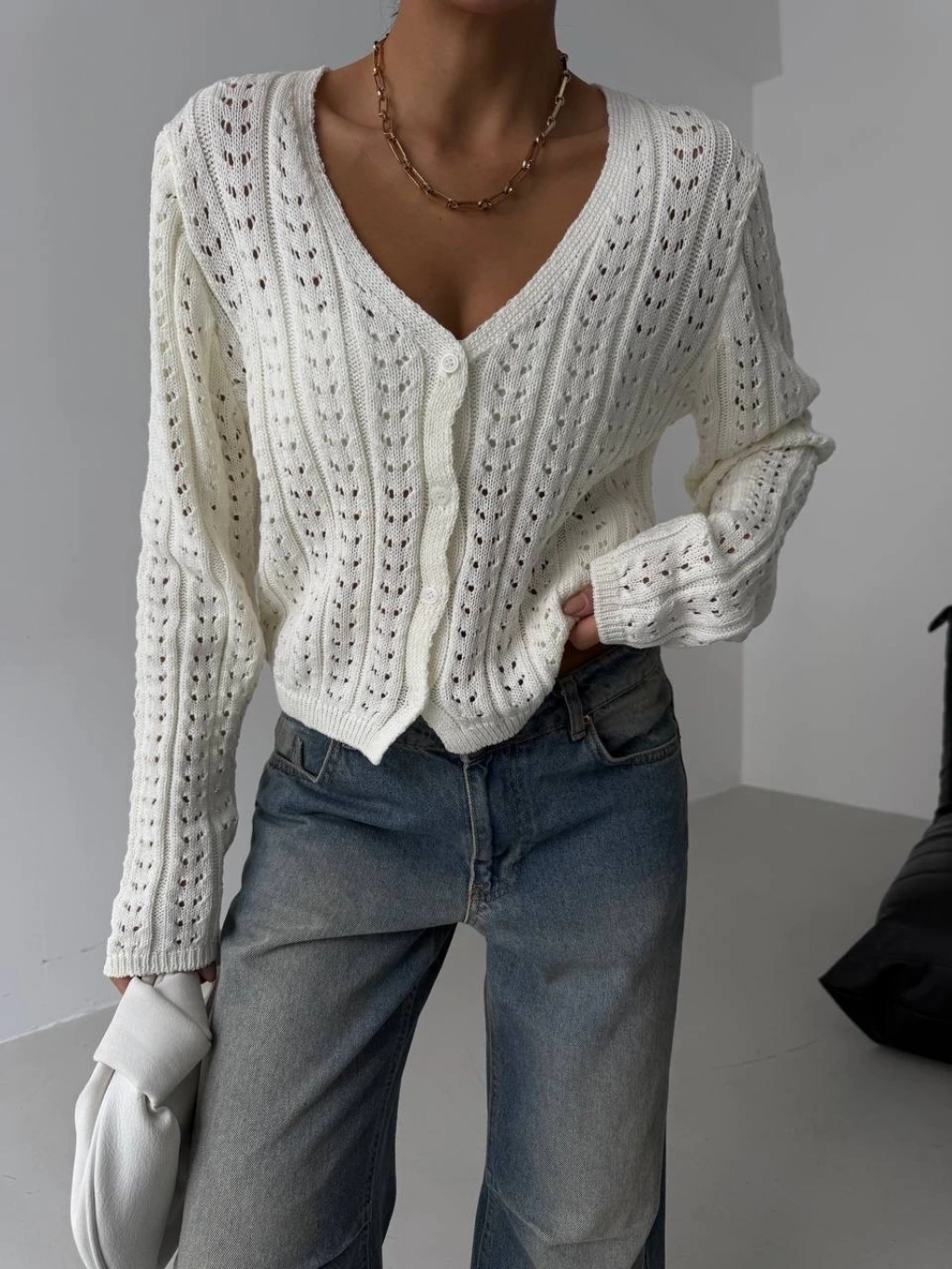 Küçük düğmeli küçük örgülü triko hırka beyaz