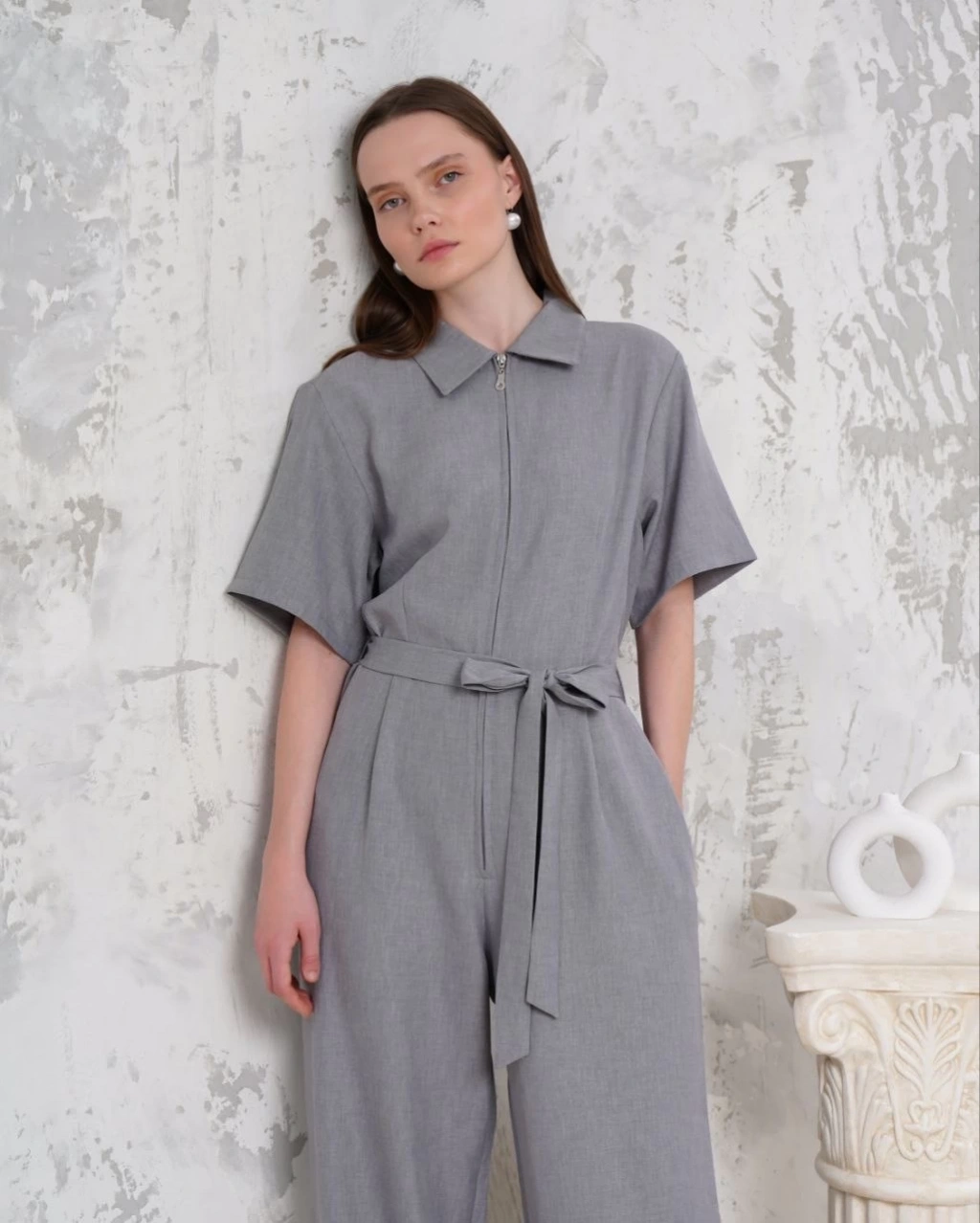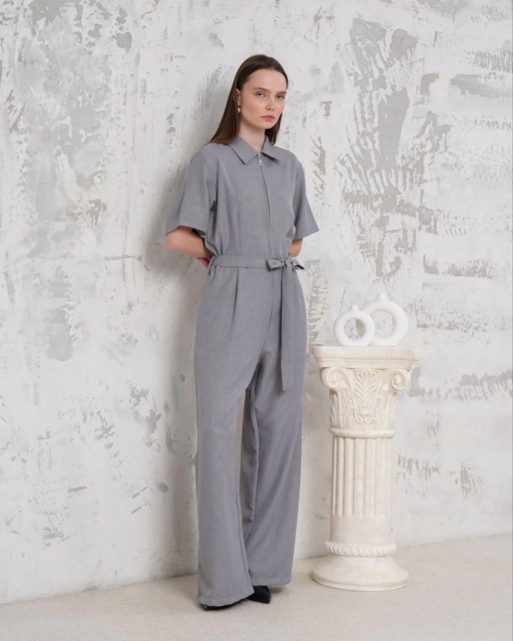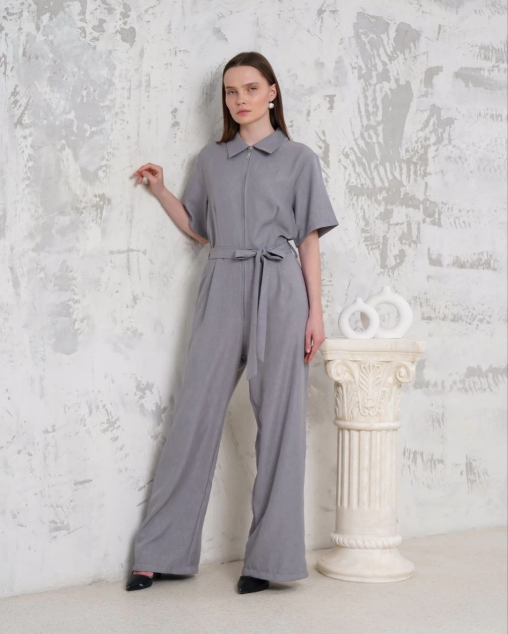 Gri kuşaklı gömlek yaka salaş tulum ile tarzınızı ortaya koyarken, gün boyu konforun keyfini çıkarın.