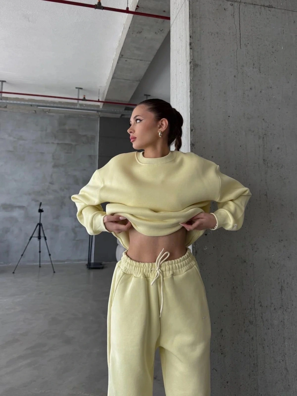 tasarladığı sarı renkli lastik paça eşofman, şıklığı ve rahatlığı bir arada sunuyor.