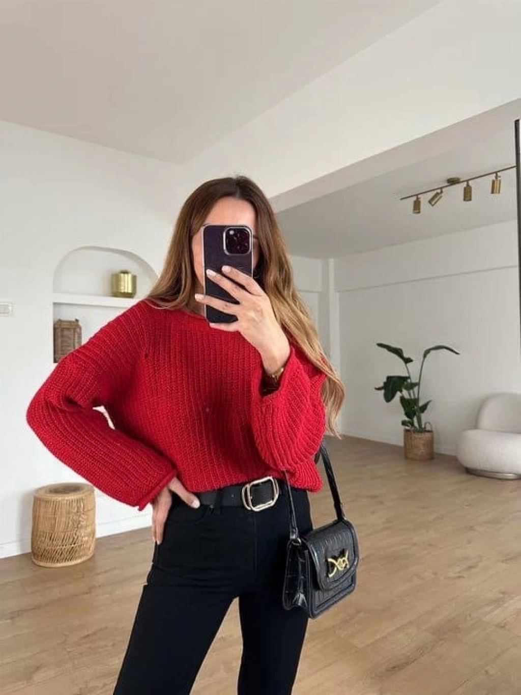 Şıklığı rahatlıkla bir araya getiren Salaş Delik Detaylı Kazak Kırmızı, gardırobunuzun vazgeçilmezi olmaya aday.