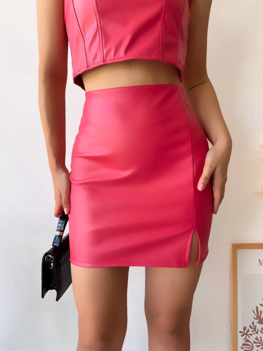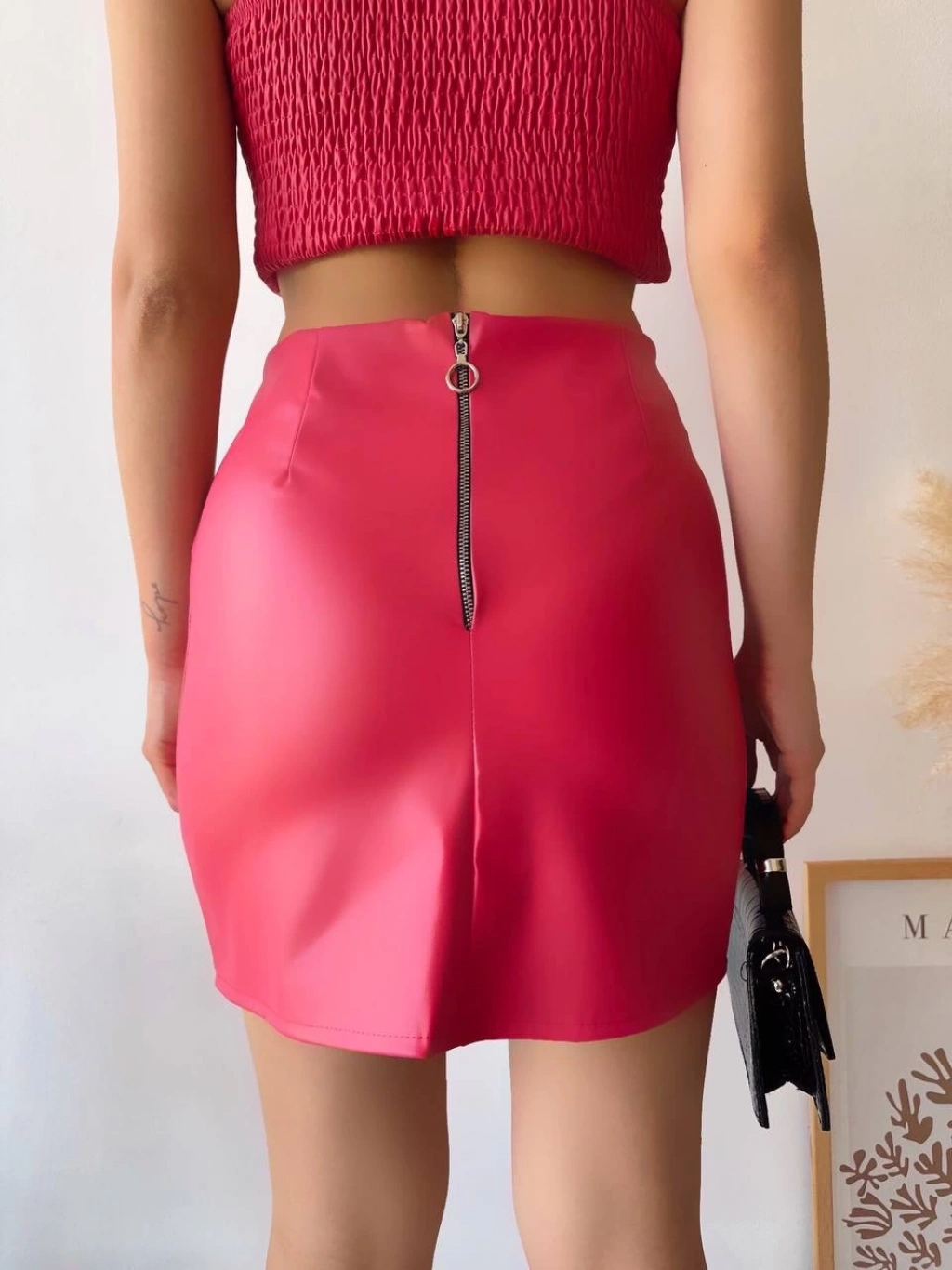 • Tek yırtmaçlı arkadan fermuarlı deri etek fuşya s24475