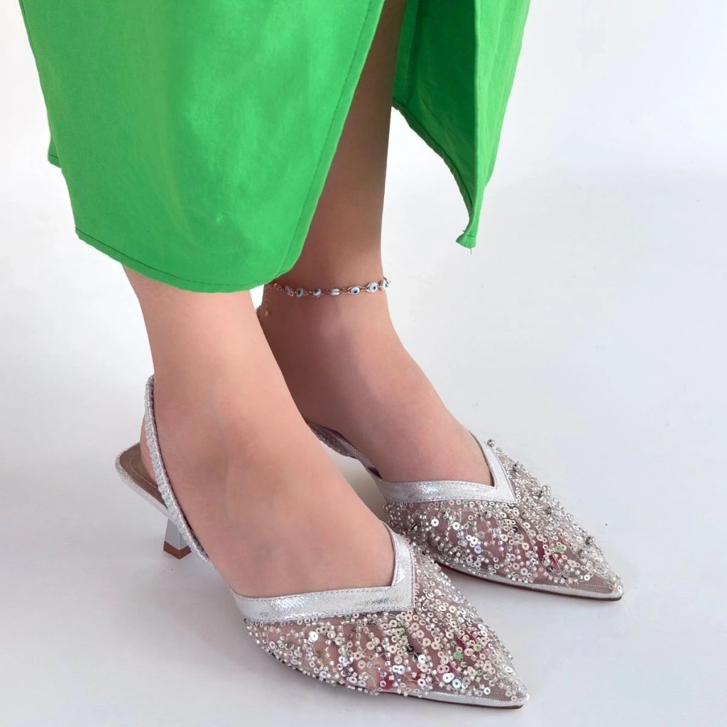 Toyi Gümüş Saten Topuklu Ayakkabı