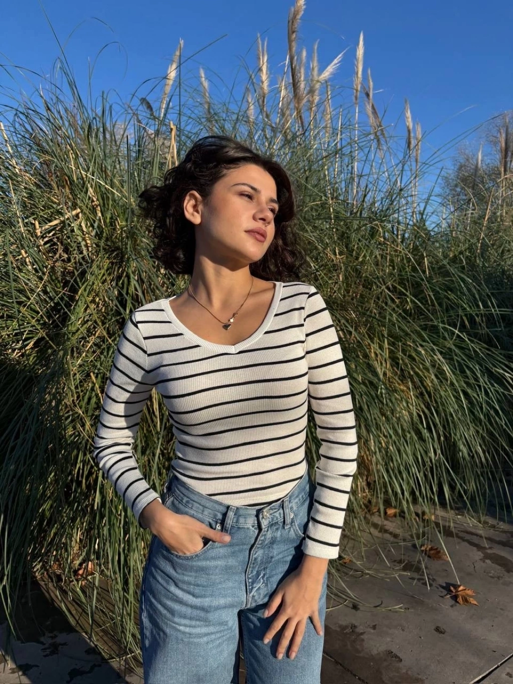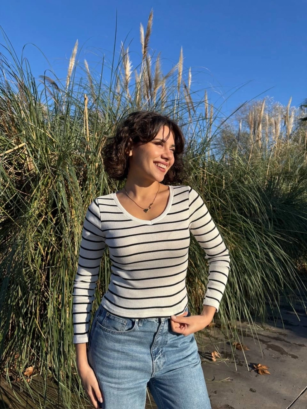 Kadın bluz modasının öncüsü olmaya aday olan beyaz V yaka çizgili bluzu hemen sepetinize ekleyin!